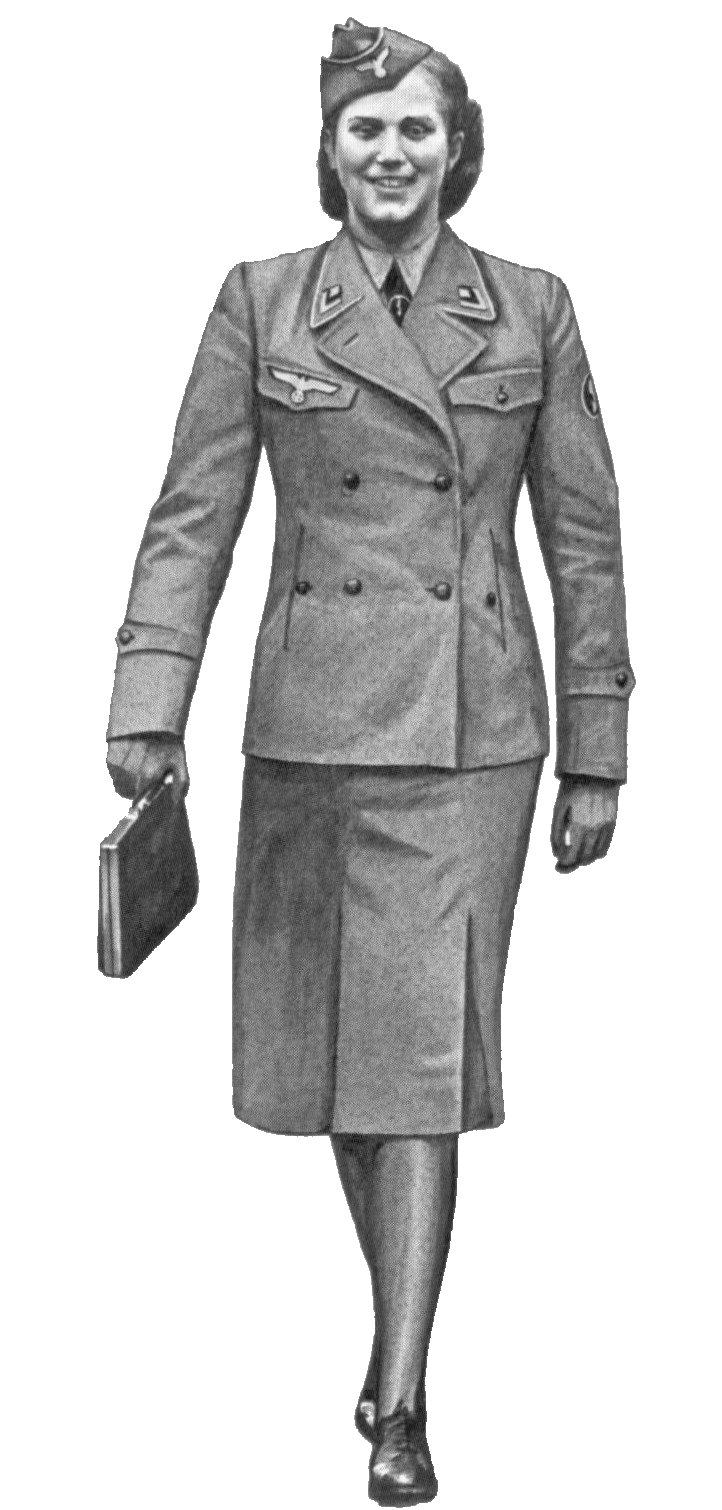 | 1 Tuchmütze 1 Regenumhang 3 Dienstblusen 2 Wolljacken 2 schwarzen Krawatten 1 Diensttasche (über die linke Schulter getragen) 1 Dienstnadel 1 Mantel 1 Kostüm mit zwei Röcken 1 weiße Bluse 3 Paar Seidenstrümpfen 2 Paar Schnürhalbschuhen 1 Paar Gummiüberziehstiefel 2 Dienstkittel mit 3 Kragen extra |